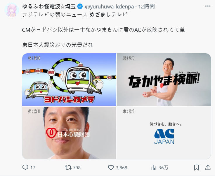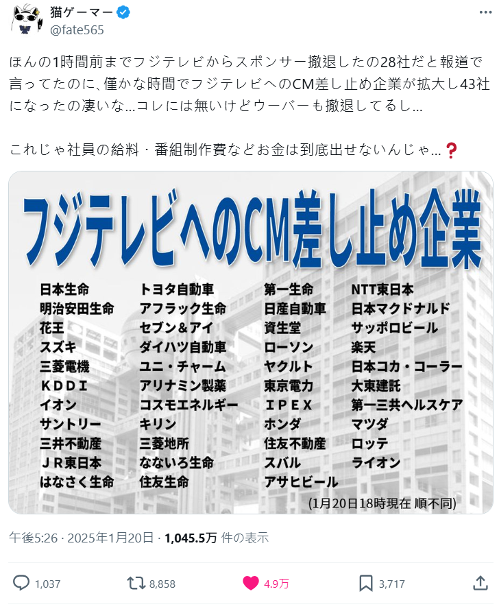 根據日本網友統計,截至 1/20 ,已經有超過 50 間企業對日本富士電視台撤回廣告投放,甚至也有不少目前也正檢討是否停止,目前富士電視台的廣告,幾乎過半僅剩下日本公共廣告機構 ( ACジャパン ) 的廣告,企業投放越來越少。
