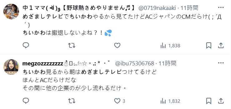 像《吉伊卡哇》動畫就是在富士電視台《めざましテレビ》(鬧鐘電視)播出,已有網友發現幾乎僅剩下日本公共廣告機構的廣告,撤廣告的現象非常明顯。