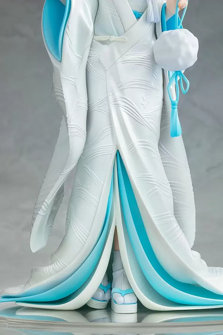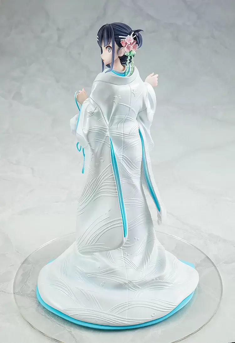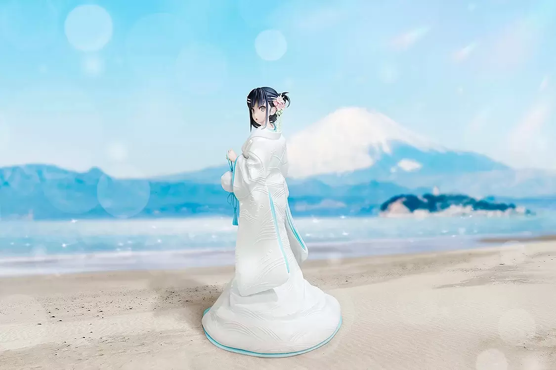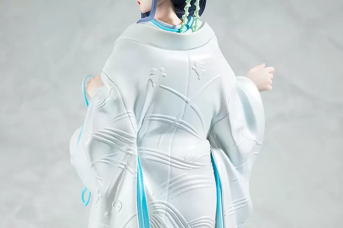 KDcolle「櫻島麻衣 白無垢Ver.」1/7比例 PVC塗裝完成品,尺寸約高 23 公分,以原作繪師溝口凱吉的插畫為基礎,將身穿白無垢的學姊立體化~盤起來的黑髮露出白皙的後頸線條,回眸的表情略帶羞澀,微微泛紅的臉頰散發更加可愛的氛圍!重現溝口凱吉插畫特有的空氣感造型及色彩,純白的打掛採用了淡淡的珍珠塗裝增添華麗,優美的花紋則以浮雕的方式表現,展現與平時不同的花嫁氣氛!