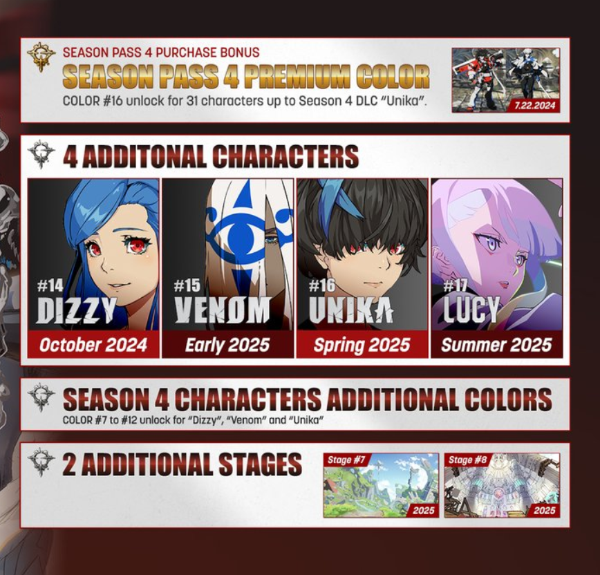 ▼《聖騎士之戰 -奮戰-》先前公布第 4 季預定登場的新參戰角色,其中 Dizzy「蒂姬」已參戰,未來還有 Venom、Unika,以及作為系列作的首位客串角色動畫《電馭叛客:邊緣行者》的 Lucy「露西」。