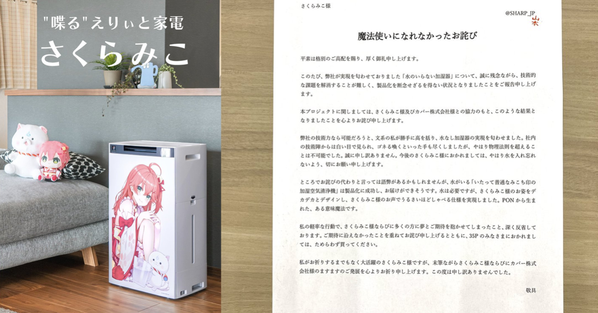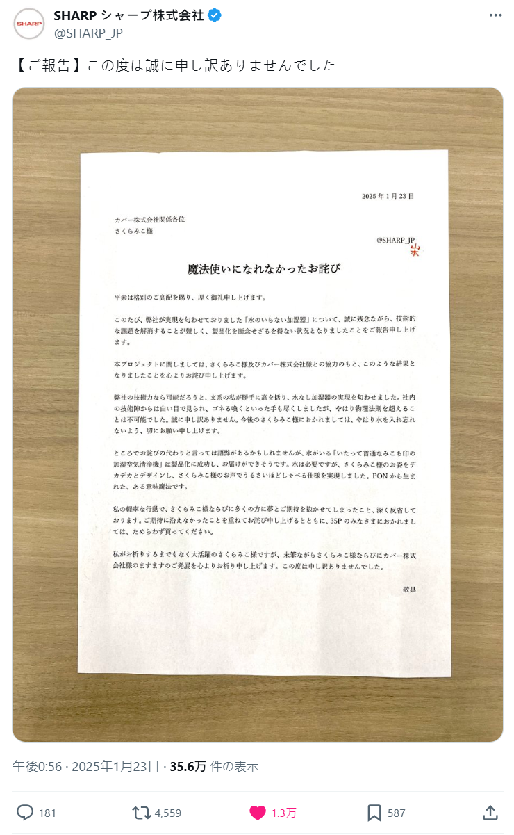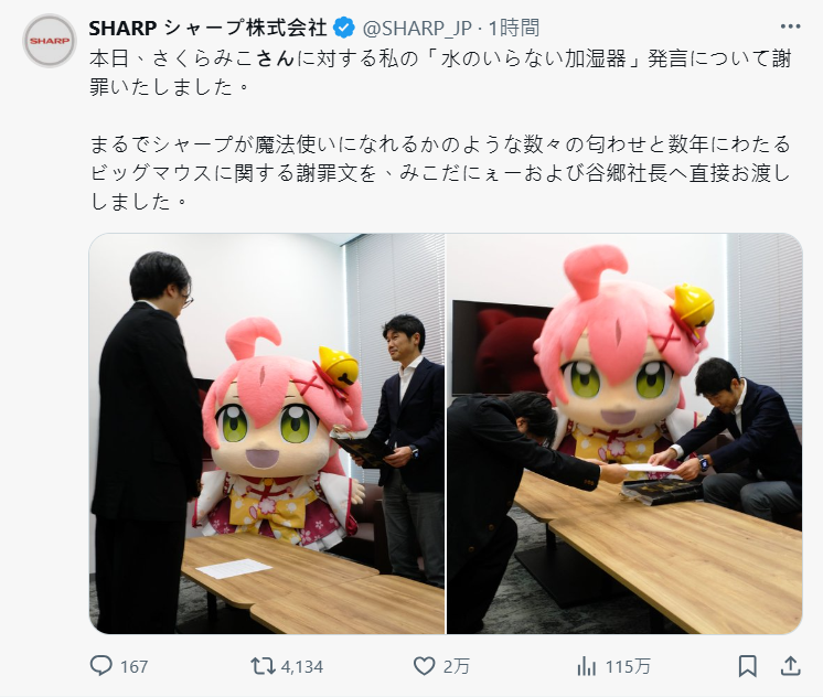 今日 ( 1/23 ) SHARP 居然在 X 上發布了一則公開道歉信,看起來好像出什麼大事了,卻又是一波奇特的產品宣傳,還跟《Hololive》的櫻巫女有關,到底是怎麼回事呢。