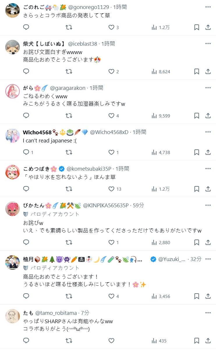 這個來由如果是 35P ( 櫻巫女的粉絲 ) 的應該熟悉,櫻巫女先前曾發生自己的加濕器從來不知道需要加水,被觀眾嘲笑當成哽的故事,而 SHARP 原本多次暗示能夠合作並且製作這樣的加濕器,結果做不出來,只好發表道歉聲明了。
