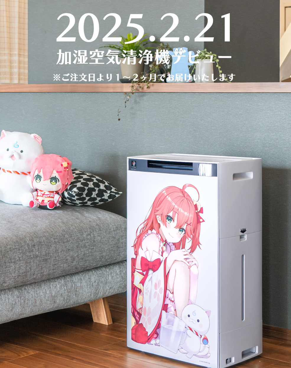 然而,作為替代方案,雖然無法實現雖然不用加水的除濕機,但我們成功地開發了「很普通的Miko親加濕空氣清淨機」,雖然還是需要加水,但該商品不僅有櫻巫女的設計外觀,還會有櫻巫女的語音,會出現 PON 的感覺,就像是魔法一樣。