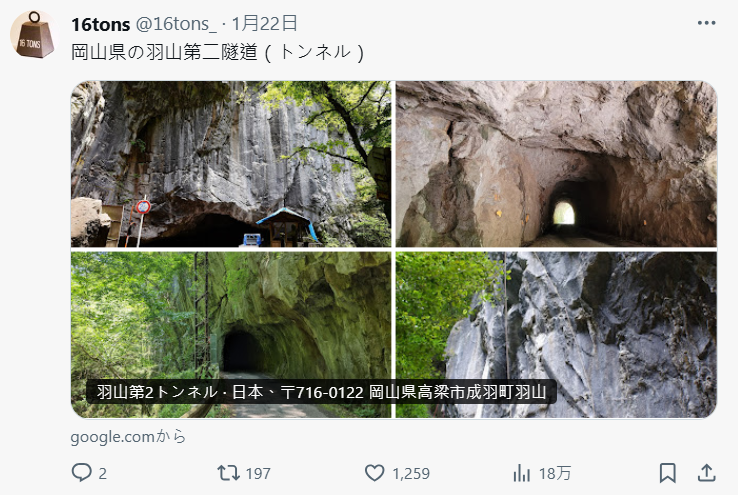 事實上,這是位於岡山縣的「羽山第二隧道」,是 1921 年時經人力挖掘鐘乳洞而建成的道路。隧道周遭的獨特自然景觀被完整保存至今,由於當地的觀光景點。由於沒有設置照明設備,近乎30m的隧道內可說是一段純粹的黑暗空間。