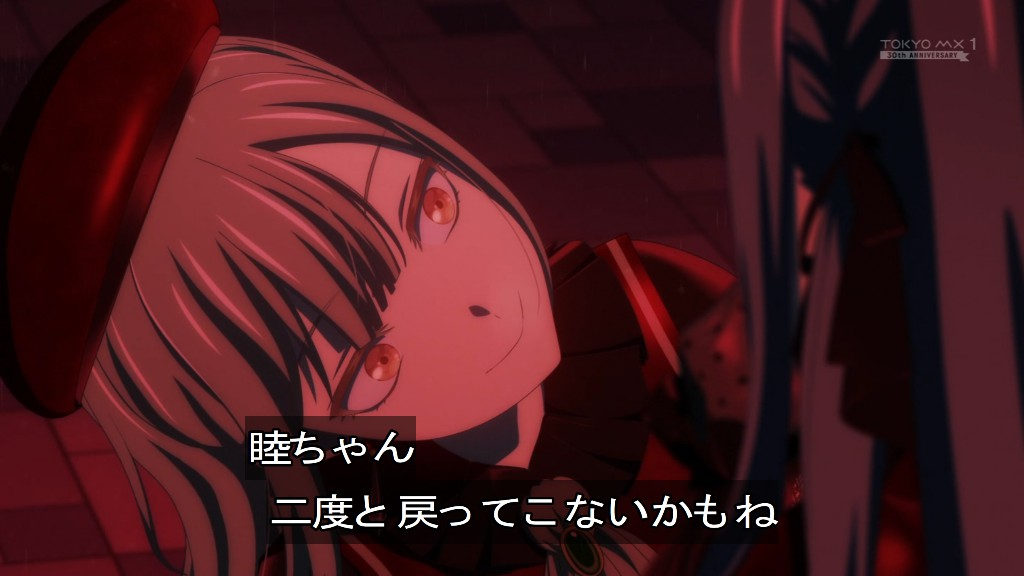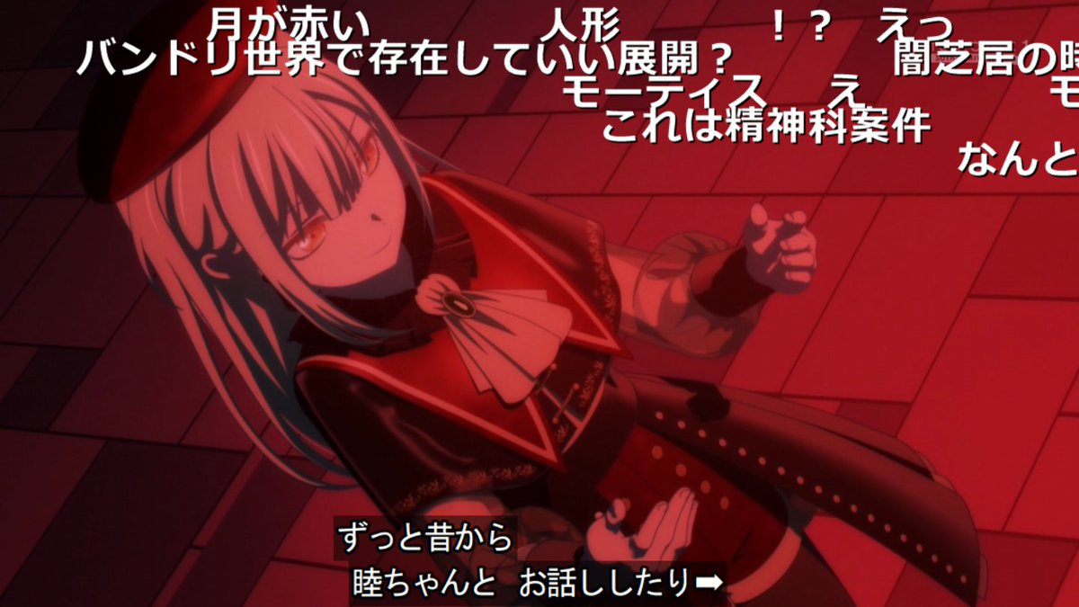 此時搭配著紅色的燈光,彷彿恐怖片般,祥子發現睦說的話並不是原先的她會說的,問她到底是誰。