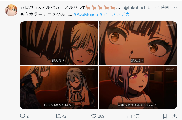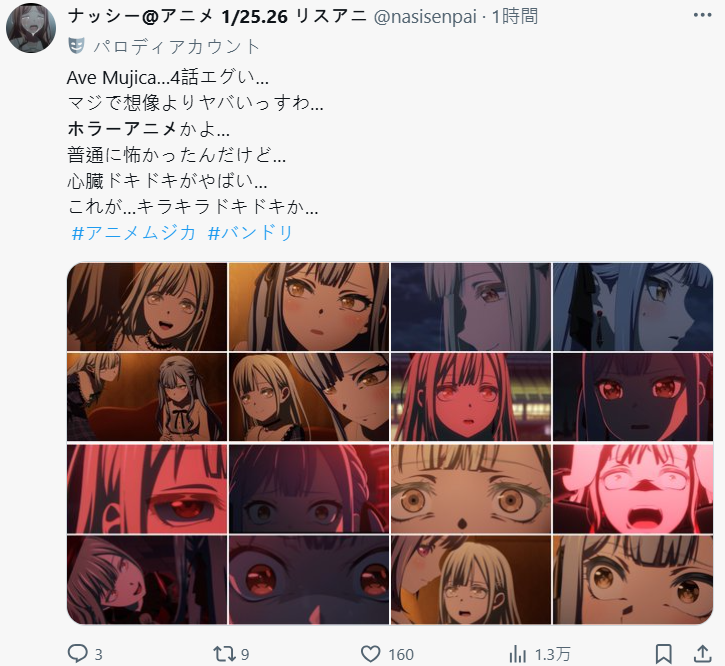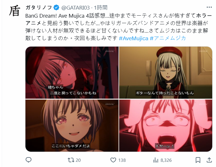 今日 ( 1/23 ) 播出了第四集,原先劇中五人好不容易成團並由若葉睦/Mortis 成為團中耀眼的星星,卻在此集砸下震撼彈,登上 X 趨勢熱搜,甚至被網友評本集為 : 「這根本是恐怖動畫吧 ! 」。
