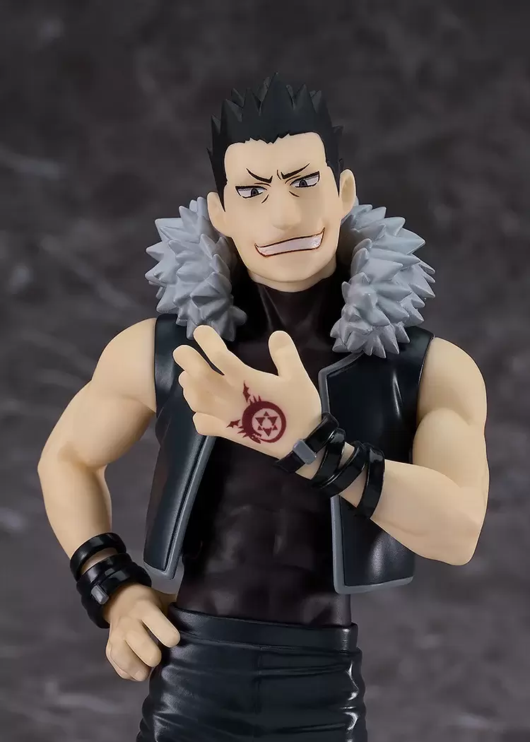 「POP UP PARADE 古利德」無比例 PVC 塗裝完成品,尺寸約高 18 公分,還原古利德狂妄、桀驁不馴的模樣,銳利的頭髮,臉上露出強勢的笑容,手插腰的姿勢露出強壯的手臂肌肉線條!在合身的小高領背心底下刻劃出精壯的肌肉、六塊腹肌線條,手背上的銜尾蛇印記也仔細還原。