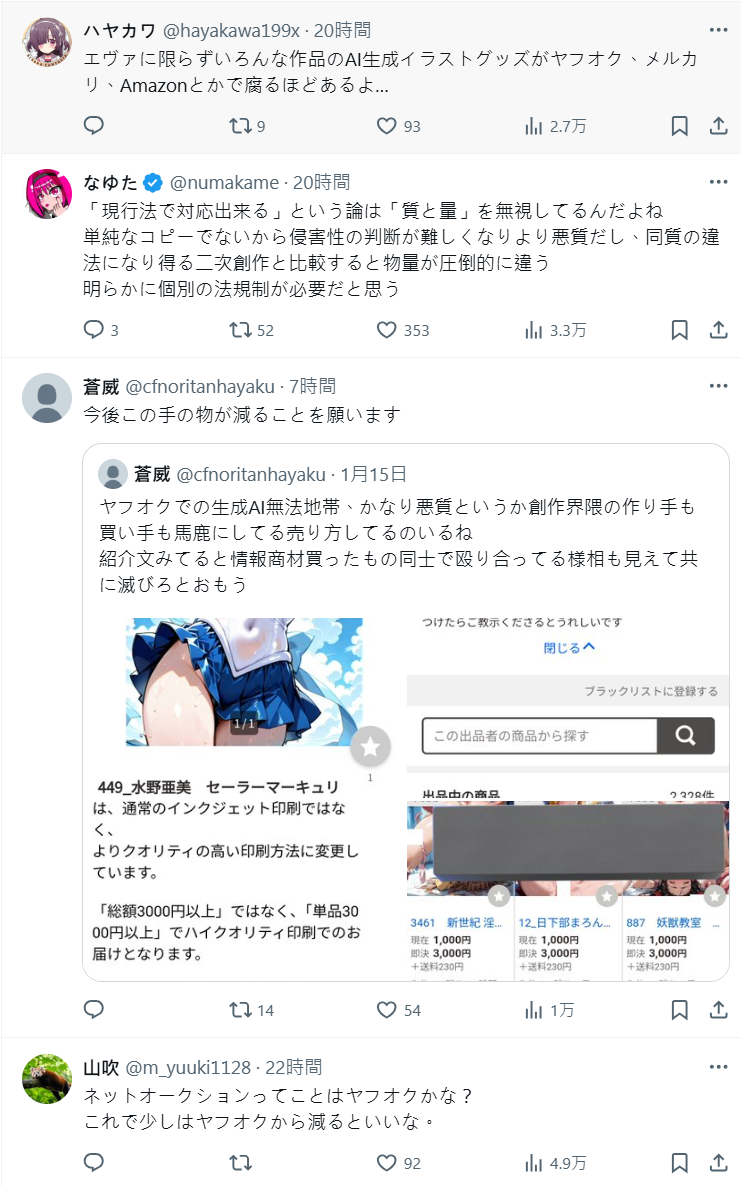 此新聞一出也不少日本網友表示,現在真的到處都有類似的惡質人士,各種拍賣、同人創作甚至電商都有用 AI 生成圖片來賺錢的現象。這種侵害著作權的非法人士如此橫行,希望警方可以嚴加查辦。