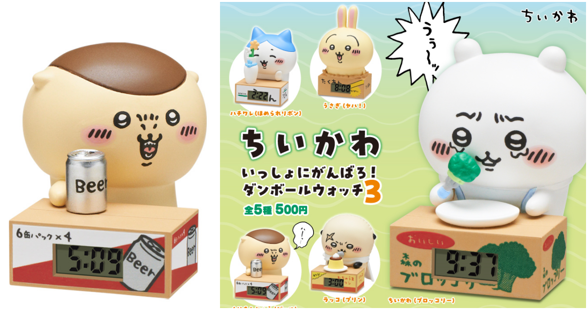 以《吉伊卡哇》中出現的角色為特色,設計成可愛又實用的座鐘系列~第三彈「吉伊卡哇 一起加油吧!紙箱時鐘3」轉蛋,尺寸約高 5 公分,收錄有:吉伊卡哇(花椰菜)、小巴(讚美絲帶)、兔兔(呀哈!)、栗子饅頭(啤酒)和海獺勇者(布丁)。無論你是想努力工作、念書學習,還是只是想放鬆一下,都可以讓小可愛陪你查看時間!時鐘部分雖小但功能強大,可以使用底部的按鈕在顯示日期和秒數之間切換。