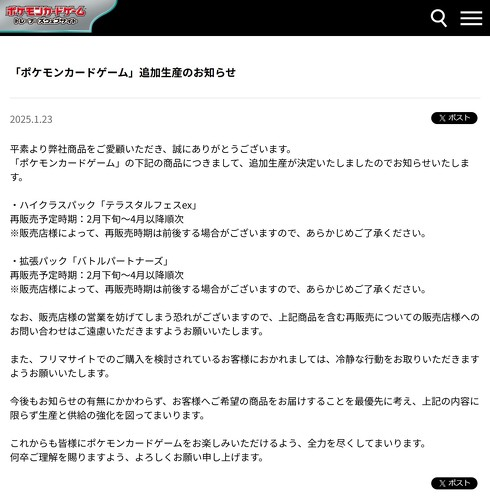 由於今日 ( 1/24 ) 發行的補充包「バトルパートナーズ」以及 12 月發行的「テラスタルフェスex」陷入搶購風潮,不少玩家爭相搶著購買供不應求,讓官方不得不宣布這兩個系列將於 2 月下旬至 4 月起陸續進行再販,引起網民熱議。