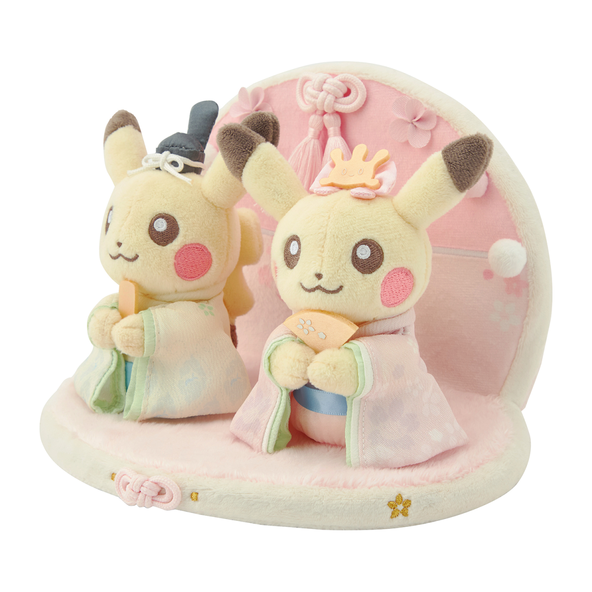 這款「皮卡丘女兒節絨毛娃娃」,效法日本傳統女兒節的「雛人形」擺設,讓成對的皮卡丘穿上應景的唐衣,手持扇子並頭戴飾品,並透過可愛的屏風展現出女兒節擺設的風貌。如果各位仔細觀看,可以看到服裝以及配件上還藏有寶可夢的設計細節喔!