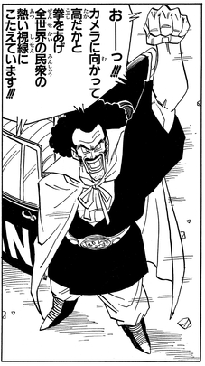 相信各位對撒旦先生這個招牌「冠軍腰帶」印象深刻,因為他在劇中以「第 24 屆天下第一武道會」冠軍身份登場。在賽魯大會時,曾仗著自己是天下第一武道會冠軍的威名,更有著冠軍腰帶宣稱悟空等人的伎倆根本是戲法。隨後賽魯被擊敗後,撒旦先生誆稱是自已的功勞,之後被孫悟空及身邊親友以外的地球人捧為英雄。