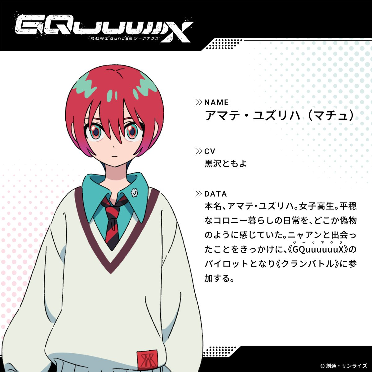 《機動戰士Gundam GQuuuuuuX》主角瑪秋本名為天手讓葉,是名高中女生。住在殖民地裡過著和平的日常生活,卻總是有種不真實的感覺。邂逅了從事走私的少女涅安,以此為契機成為了「GQuuuuuuX」的駕駛員,並且參加了「戰團對決」。
