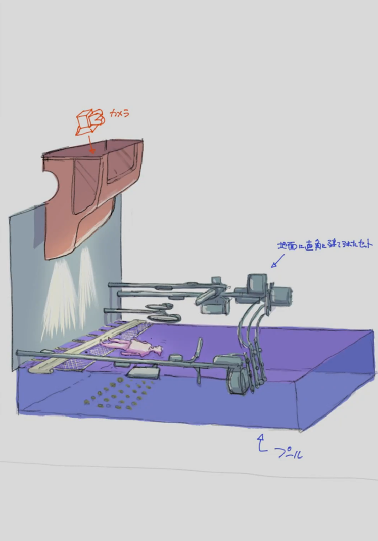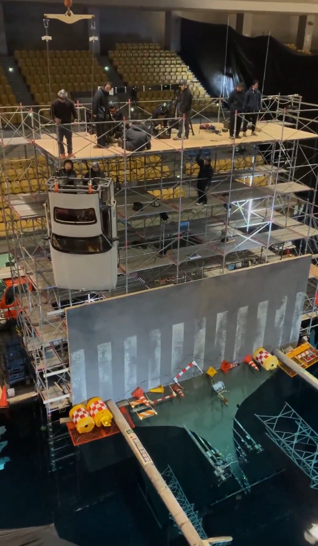 根據導演柳澤翔分享的拍攝構圖,必須透過懸掛汽車的方式,從上而下對著底下的游泳池來拍攝,才能拍出真正人漂浮在水中的效果。