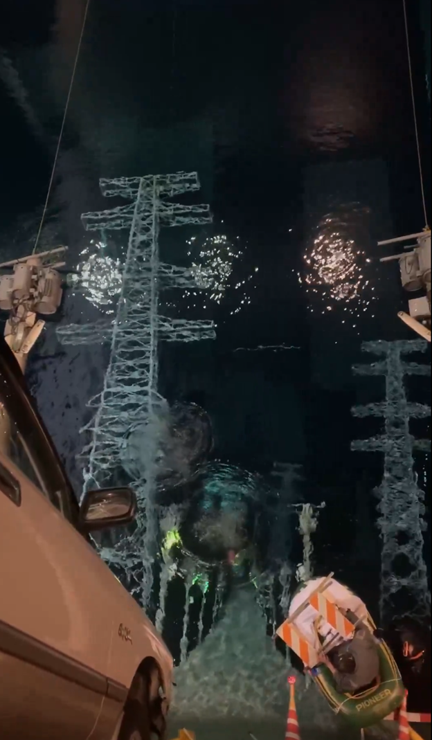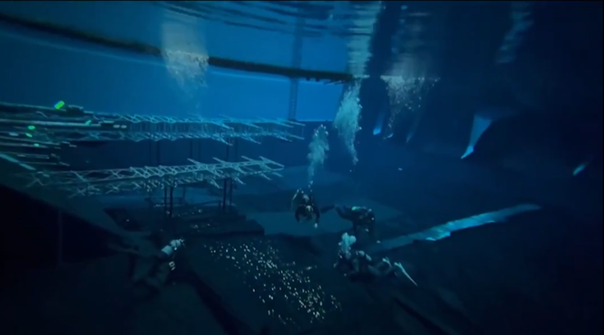 連背景的電塔、燈光設備,都是工作人特別潛水到水底裡面架設,並透過特別的擺設方式設計,才能呈現出那種遠近深入的視覺效果。