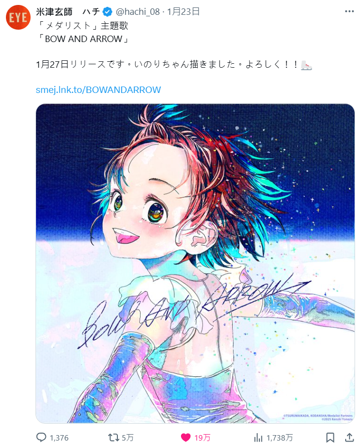 不過別以為米津玄師只有音樂上面的才能,近日因為他替本季以花式滑冰為題材的動畫《金牌得主》( メダリスト ) 演唱片頭曲〈BOW AND ARROW〉,他最近也公布了自己繪製的單曲封面,精緻的成果讓不少網友懷疑,這傢伙的能耐到底有沒有極限。