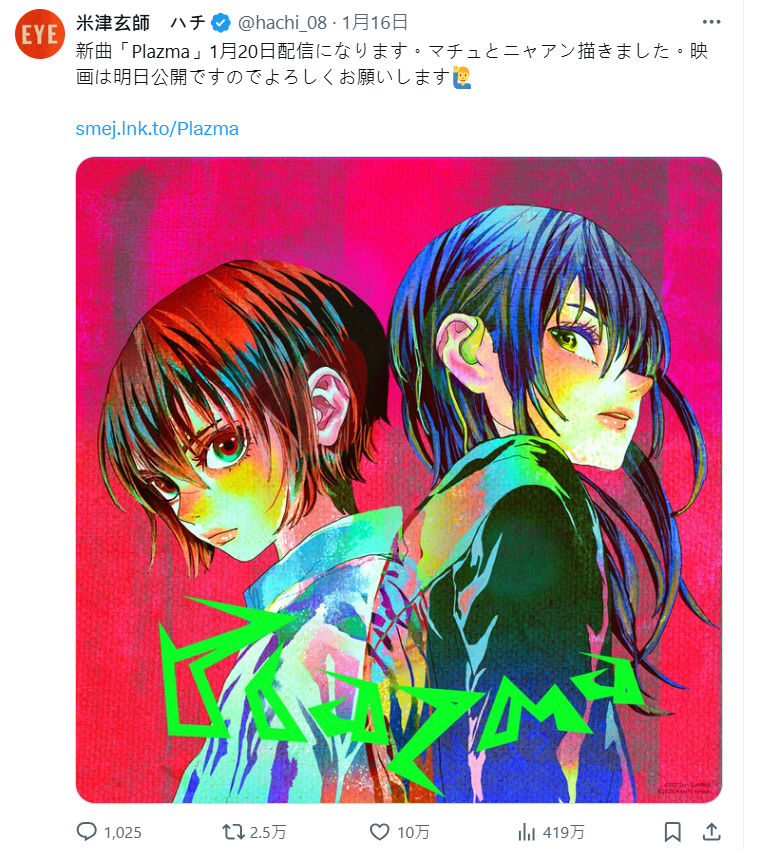 不只如此,米津玄師近期還演唱劇場版《機動戰士Gundam GQuuuuuuX-Beginning-》主題曲〈Plazma〉,也自己繪製主角天手讓葉 ( 瑪秋 ) 與涅安作為單曲封面。雖說與原作風格非常不同,但也看到米津玄師是可以創作出自己的繪圖風格。