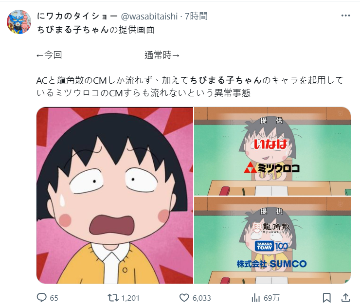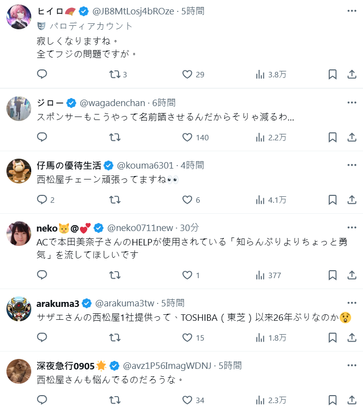 X 上掀起討論,讓《海螺小姐》和《櫻桃小丸子》雙雙登上熱搜榜。有網友表示:「太震撼了……」、、「以前《海螺小姐》的贊助商很多,現在居然只剩西松屋,全是AC日本的廣告」、「《櫻桃小丸子》連贊助都沒了,這情況真的不太妙」、「雖然感到有點難過,但這全部都是富士電視台自己的問題!」。