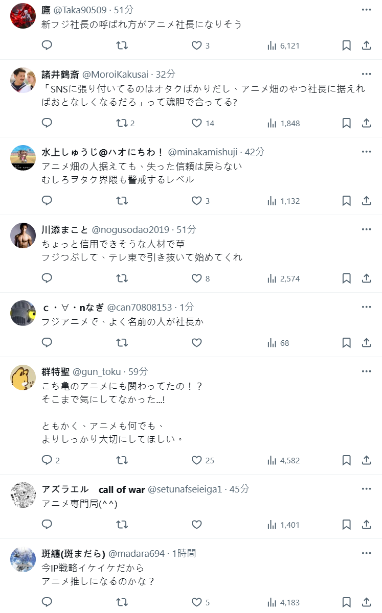 也有人樂觀猜測:「富士的新社長是清水賢治,這是不是表示動畫播出時段會增加?希望能放在更多年輕世代能看到的時間。」