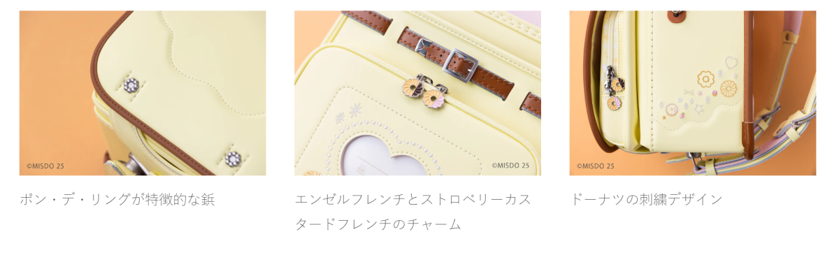 這系列書包靈感來自 Mister Donut 的人氣商品,包括 : 「波堤」、「黃金巧克力甜甜圈」、「天使奶油」和「草莓圈圈」,並將這些招牌點心的配色巧妙融入書包設計。從刺繡、吊飾到內裝,每一處細節都充滿甜甜圈的可愛魅力!