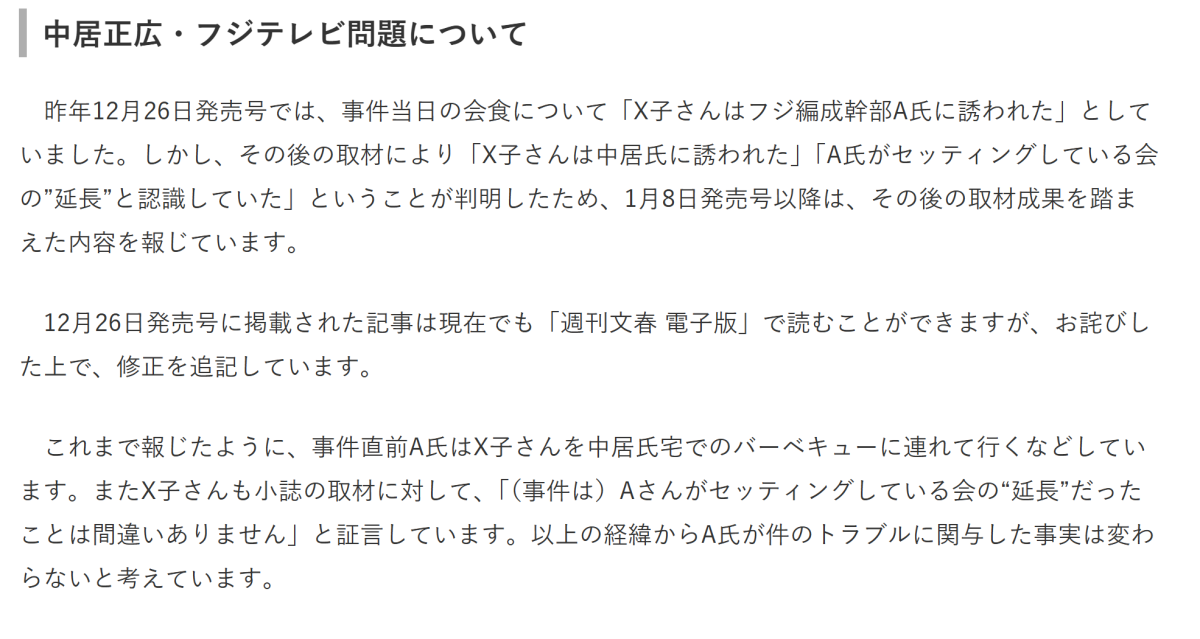 在更正聲明中提到:「刊登於去年 12 月 26 日發行的期刊的文章中,提到事件當日的餐敘情況為『X 女士是由富士編排部幹部 A 氏邀請參加』,但經後續採訪得知,實際情況是『X 女士是由中居本人邀請』,且『她認為這是 A 氏所安排聚會的“延續”』,我們特此道歉並予以更正。」
