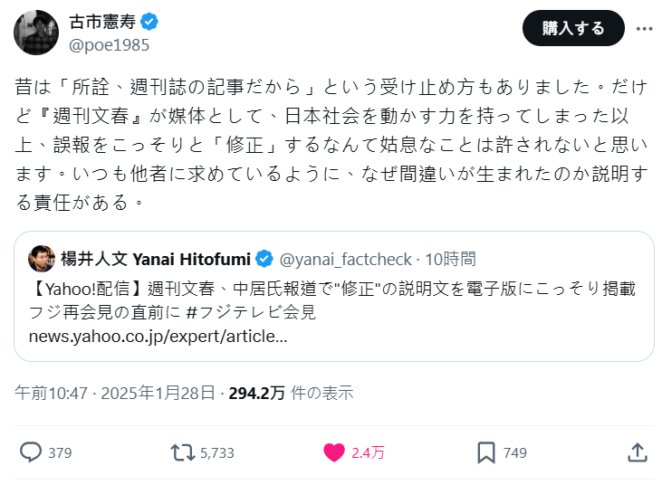 雖說過去週刊文春的爆料有精確命中過,也不是沒有如此失誤的經驗,但對民眾來說,擁有足以在社會與實體層面上抹殺一個人的影響力的文春,竟然這麼隨便地更正這麼重要的事實,真的讓人難以接受這種媒體的責任感究竟何在。