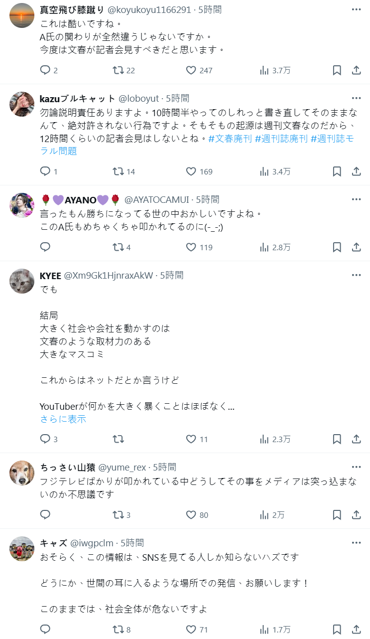 但目前富士電視台可說是已經被燒到開記者會卻無法解釋且澆不熄怒火的地步,這麼重要的事實用這樣的方式更正,讓許多網友大為不悅,認為週刊文春絲毫不認為有過錯,如此隨便更正讓人憤怒。