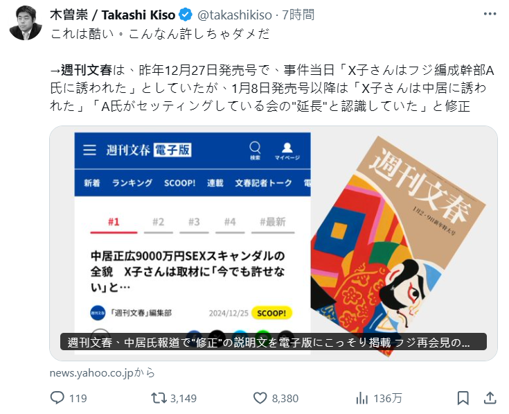 卻在今日 ( 1/28 ) 週刊文春發表更正聲明,指出當時文章指出『X 女士 ( 受害女性 ) 是由富士電視台編排部幹部 A 氏邀請參加』,但經後續採訪得知,實際情況是『X 女士是由中居本人邀請』,這次更正讓不少日本網民大為不悅,認為這樣的錯誤報導造成民眾誤解,也讓戰火又延燒到週刊文春上。