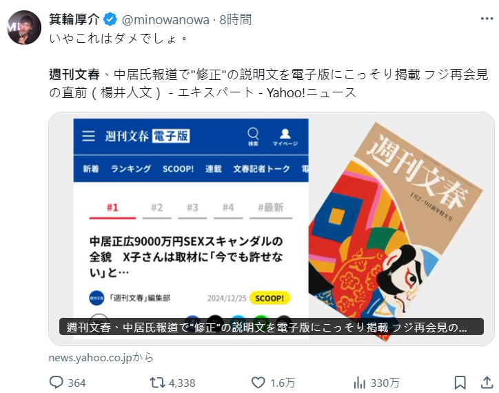 ▼ 不少日本媒體人士都砲轟週刊文春對更正的處理方式。