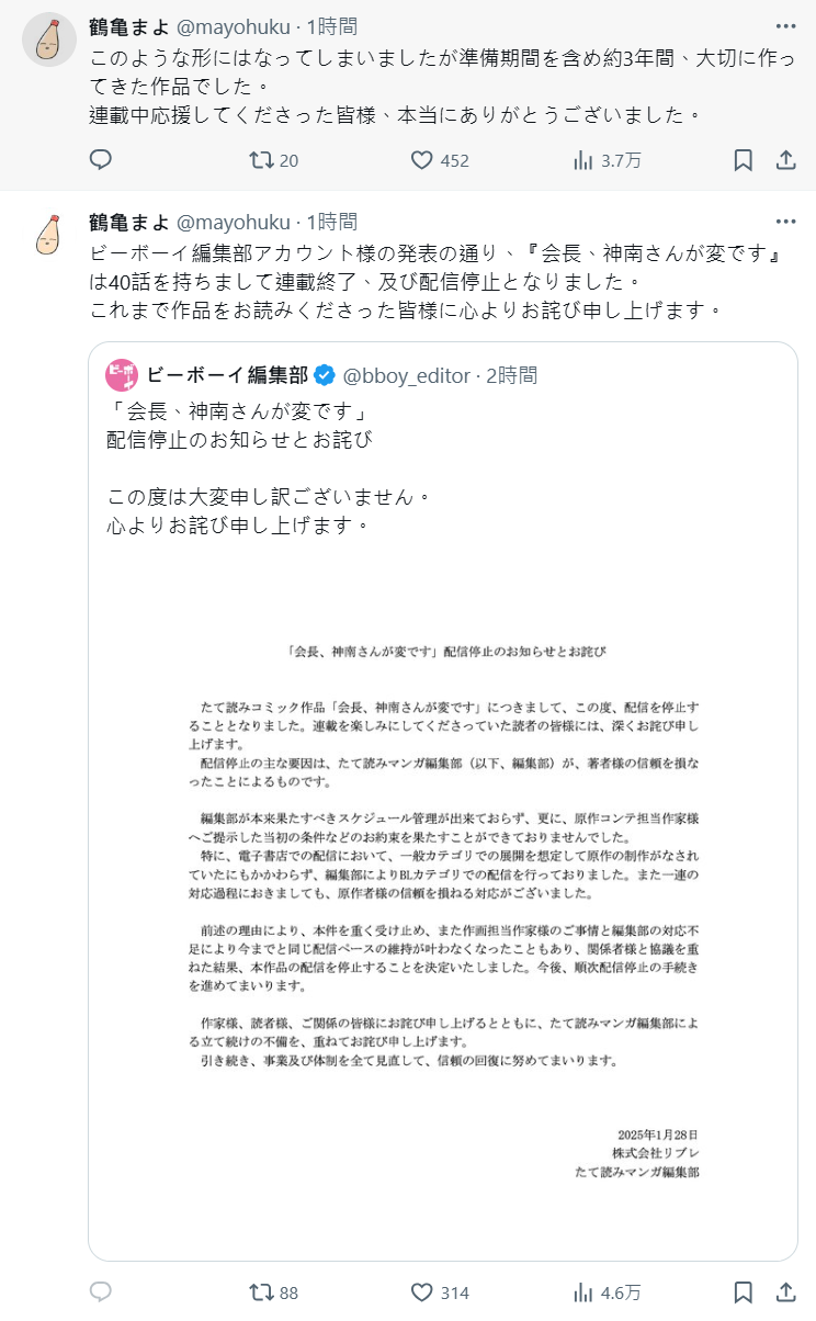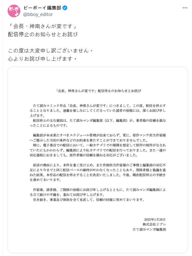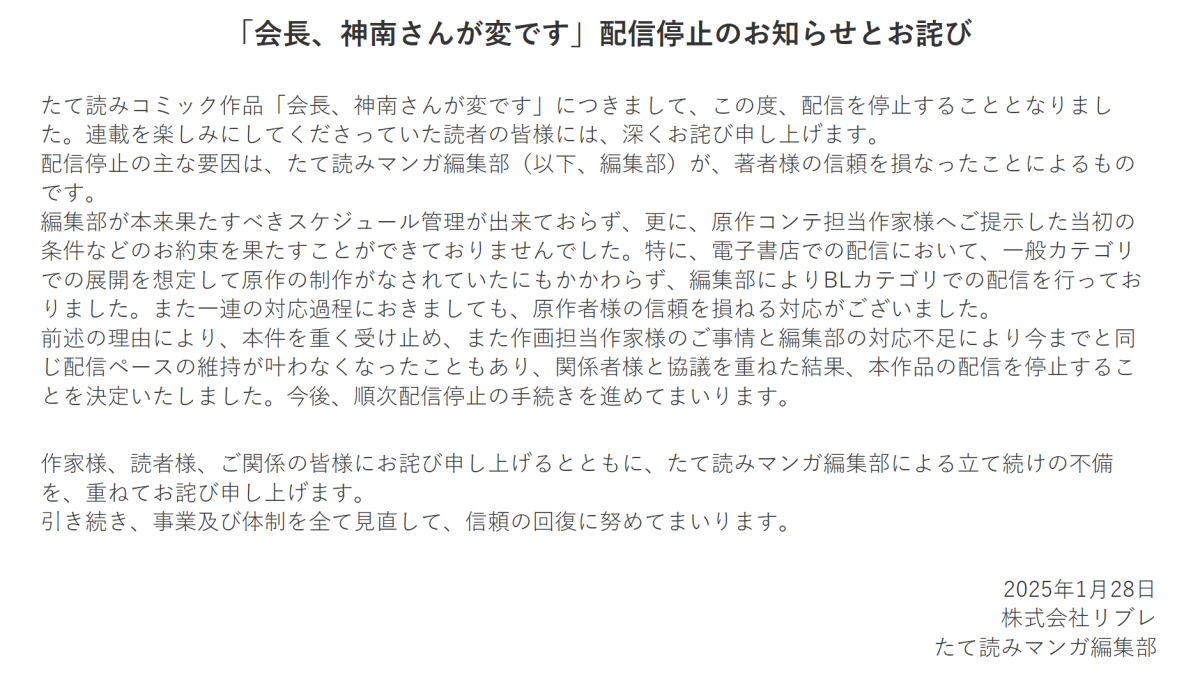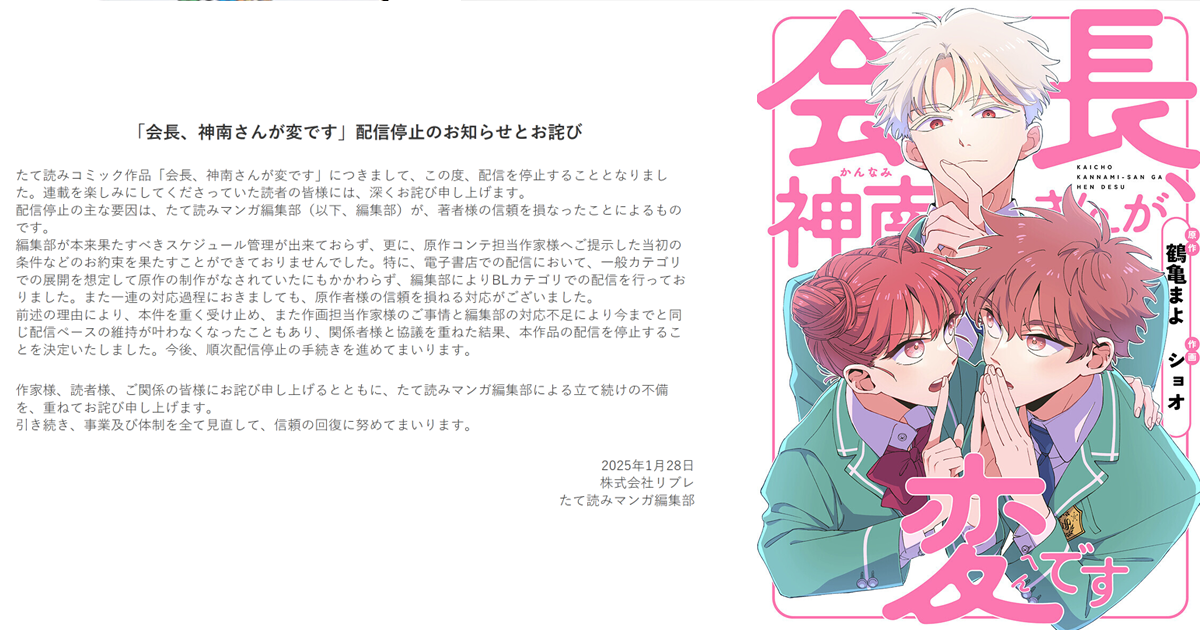 最後,編輯部致歉:「我們向作家、讀者及所有相關人士深表歉意,並對直式漫畫編輯部接連發生的失誤再次致以最深的歉意。我們將徹底檢討業務運作及體制,並致力於重建信任。」
