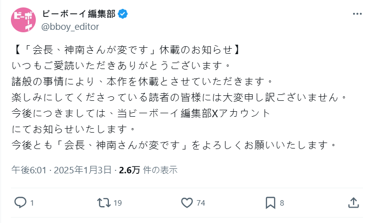 根據「ビーボーイ」編輯部公告表示:「針對直式閱讀漫畫《會長,神南先生很奇怪》,我們深感遺憾地宣布停止該作品的配信。在此向期待連載的讀者朋友們深表歉意。」