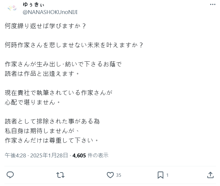 這次又因為出包跟作者鬧翻,要重複多少次才會學會呢?讓人擔心現在還在出版社執筆的作家,即使對出版社不再抱有期待,但請務必尊重作家