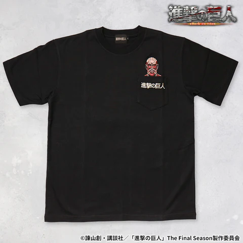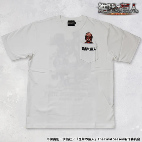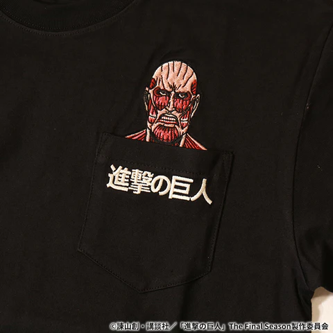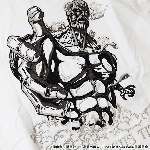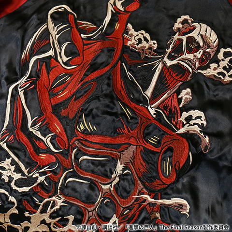 正面以立體刺繡呈現調查兵團時期的 艾連 & 米卡莎,搭配櫻花點綴細節。另一面則是壓倒性的超大型巨人刺繡設計,展現磅礡氣勢!