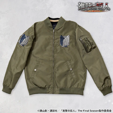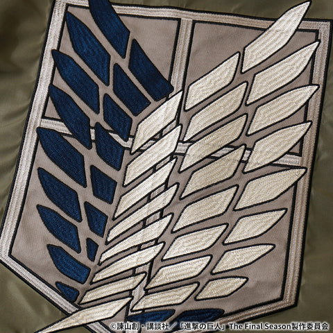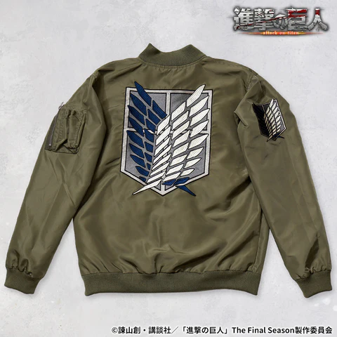正面帥氣呈現里維揮舞刀刃的戰鬥場面,胸前刺繡「瑪利亞之牆」與「超硬質刀刃」標誌。反面則為調查兵團經典徽章刺繡,打造軍風 MA-1 飛行夾克造型。