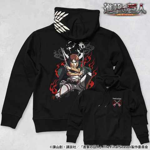 背面為艾連人物刺繡,連帽處繡有調查兵團徽章,採用刺繡與拔染印刷技術,簡單卻不失細節。
