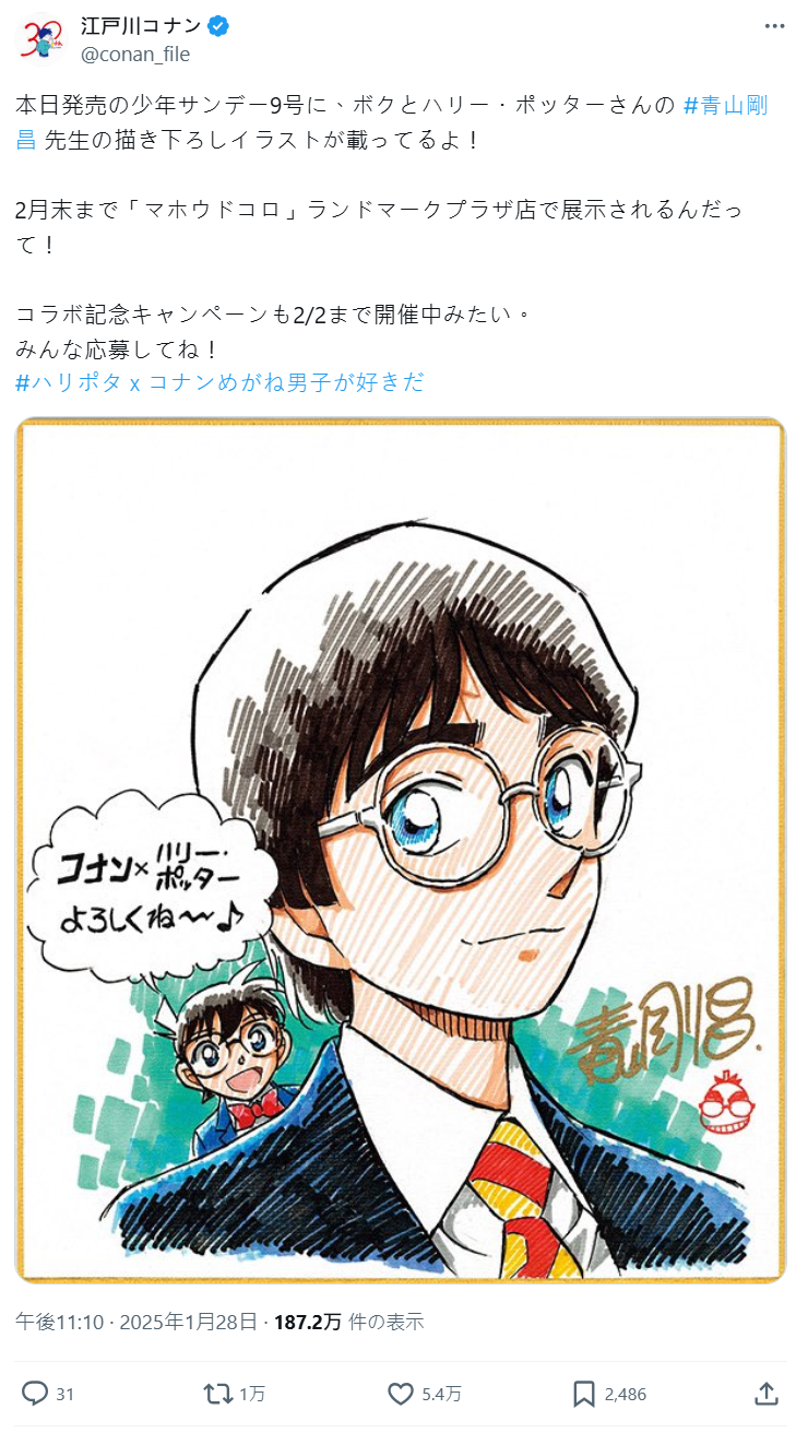 這幅插圖也收錄在 1/28 發行的《週刊少年Sunday》9 號,也因逢《名偵探柯南》連載 30 周年,官方以「最強メガネ男子」為企劃合作,青山剛昌親自操刀繪製了「哈利波特」插圖!這幅作品上還附上了青山老師的親筆訊息:「柯南 × 哈利波特,請多多指教~♪」
