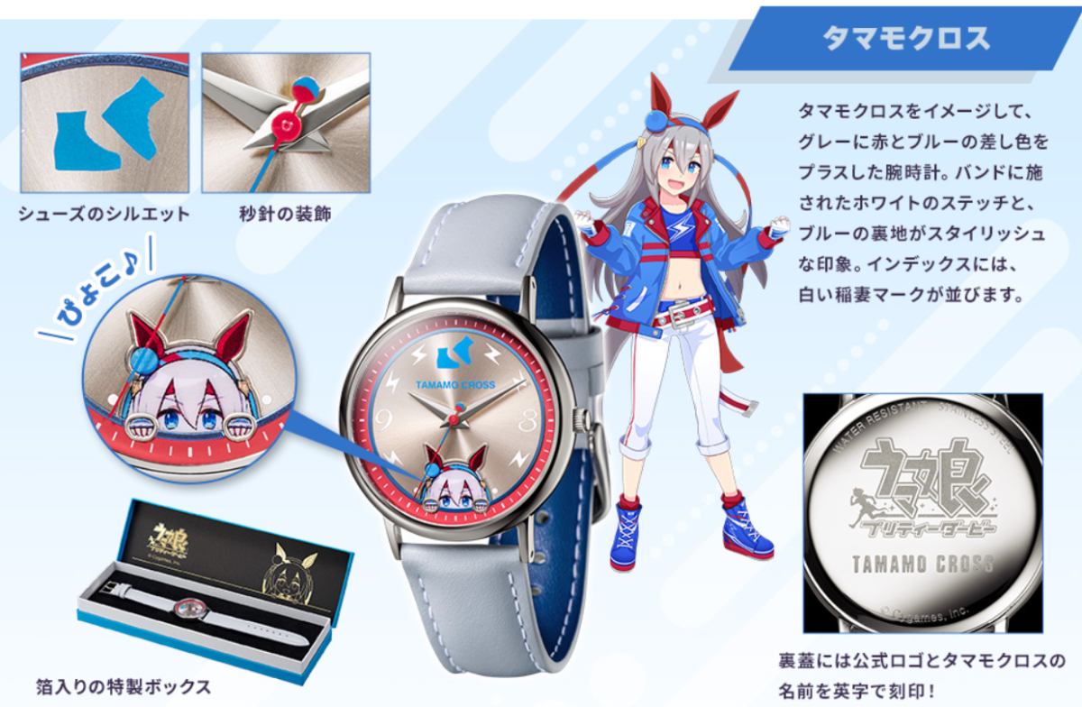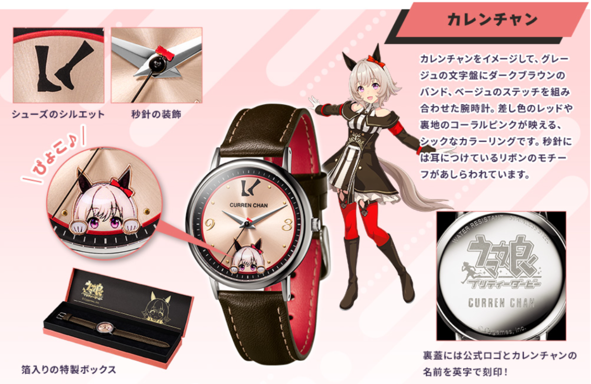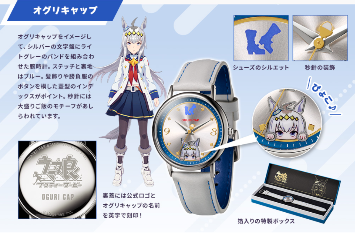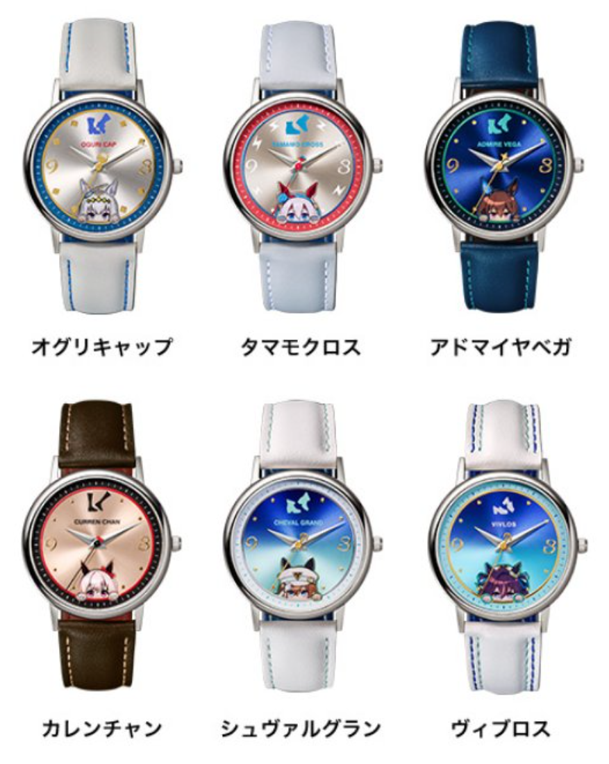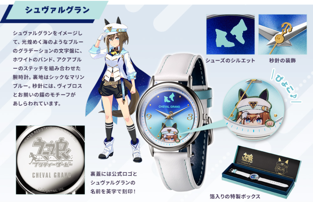 每一款都結合各馬娘的特色配置在手錶設計細節上,包含 : 12 點鐘方向的鞋子、秒針上的裝飾設計、6 點鐘處有著 Q 版的角色大頭插圖,每一款錶背都有各自的專屬英文字樣跟作品 Logo,並配有金箔設計的收納盒裝。