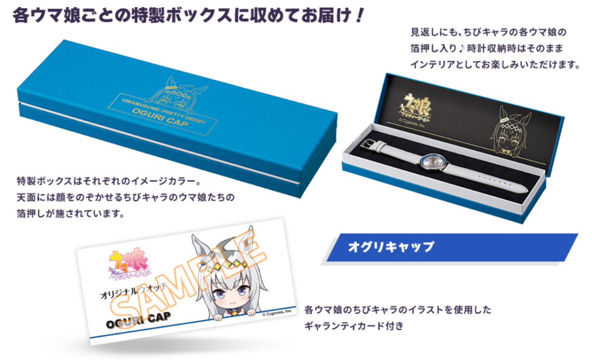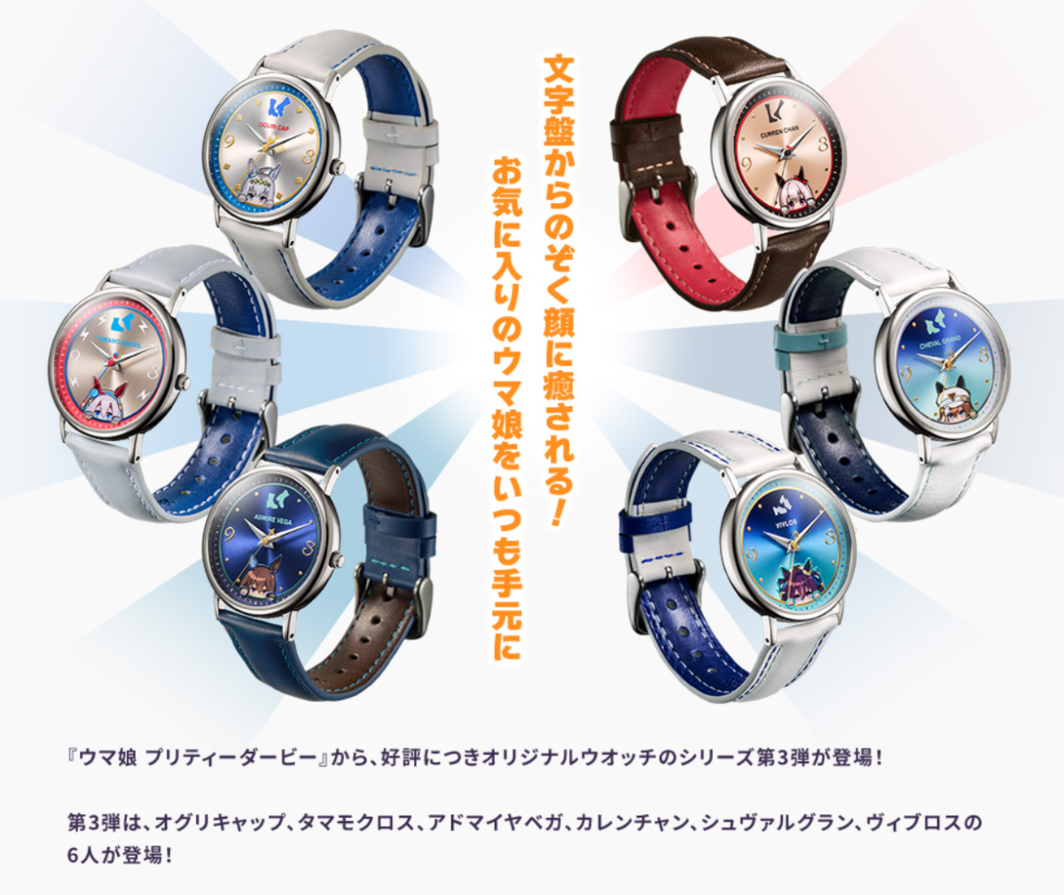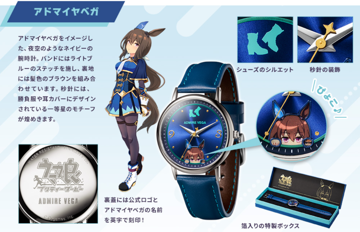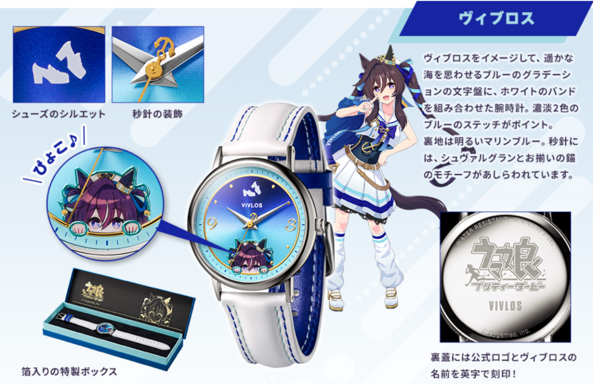 每一款都結合各馬娘的特色配置在手錶設計細節上,包含 : 12 點鐘方向的鞋子、秒針上的裝飾設計、6 點鐘處有著 Q 版的角色大頭插圖,每一款錶背都有各自的專屬英文字樣跟作品 Logo,並配有金箔設計的收納盒裝。