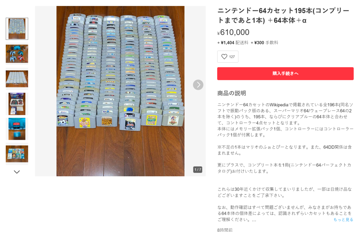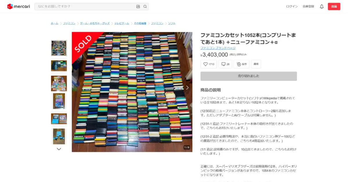 不過近期在日本二手交易平台 「Mercari」上,有賣家上架了「僅差 1 款就湊齊全套的紅白機遊戲 1052 款」,日前以超過 340 萬日圓(含運費) 上架,並在 1 月 29 日下午宣布「已售出」,這驚人的收藏與價錢也獲得不少網友熱議。