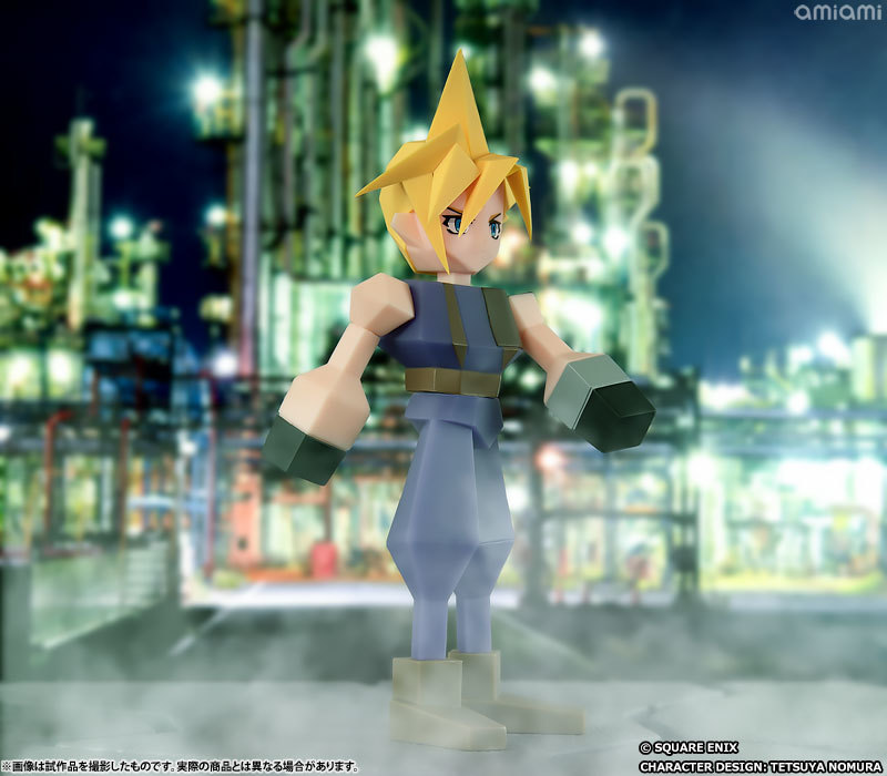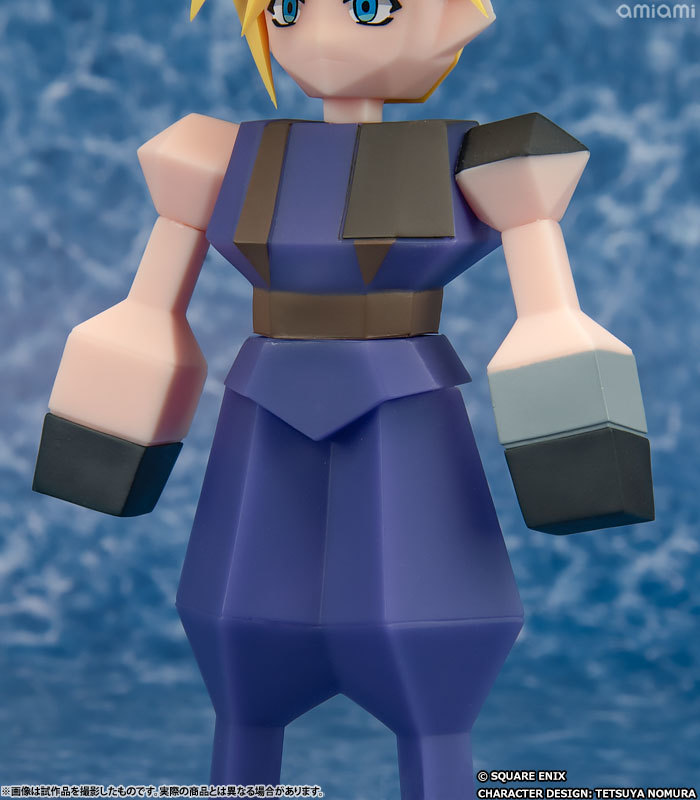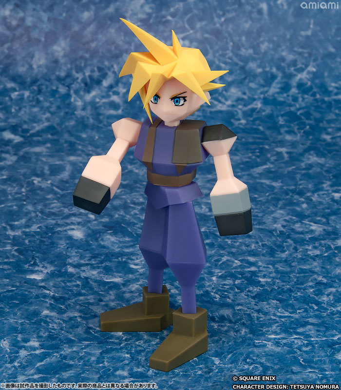「方塊人軟膠模型 克勞德·史特萊夫」基於 1997 年 PS 平台的原版《FINAL FANTASY VII》登場的形象製作,在全高約 15 公分的尺寸下還原低面數的多邊形姿態。彷彿摺紙的金髮、酒瓶般的雙臂勾起了玩家們遊玩原版的回憶,包含雙眼圖樣的印刷、服裝各部色塊的塗裝皆有還原,雙臂、腰部、腳掌等處設有簡易的水平轉軸可動。