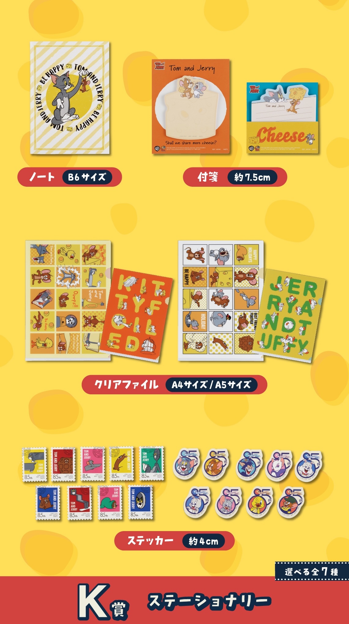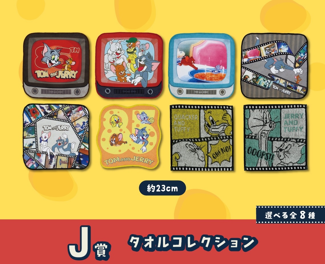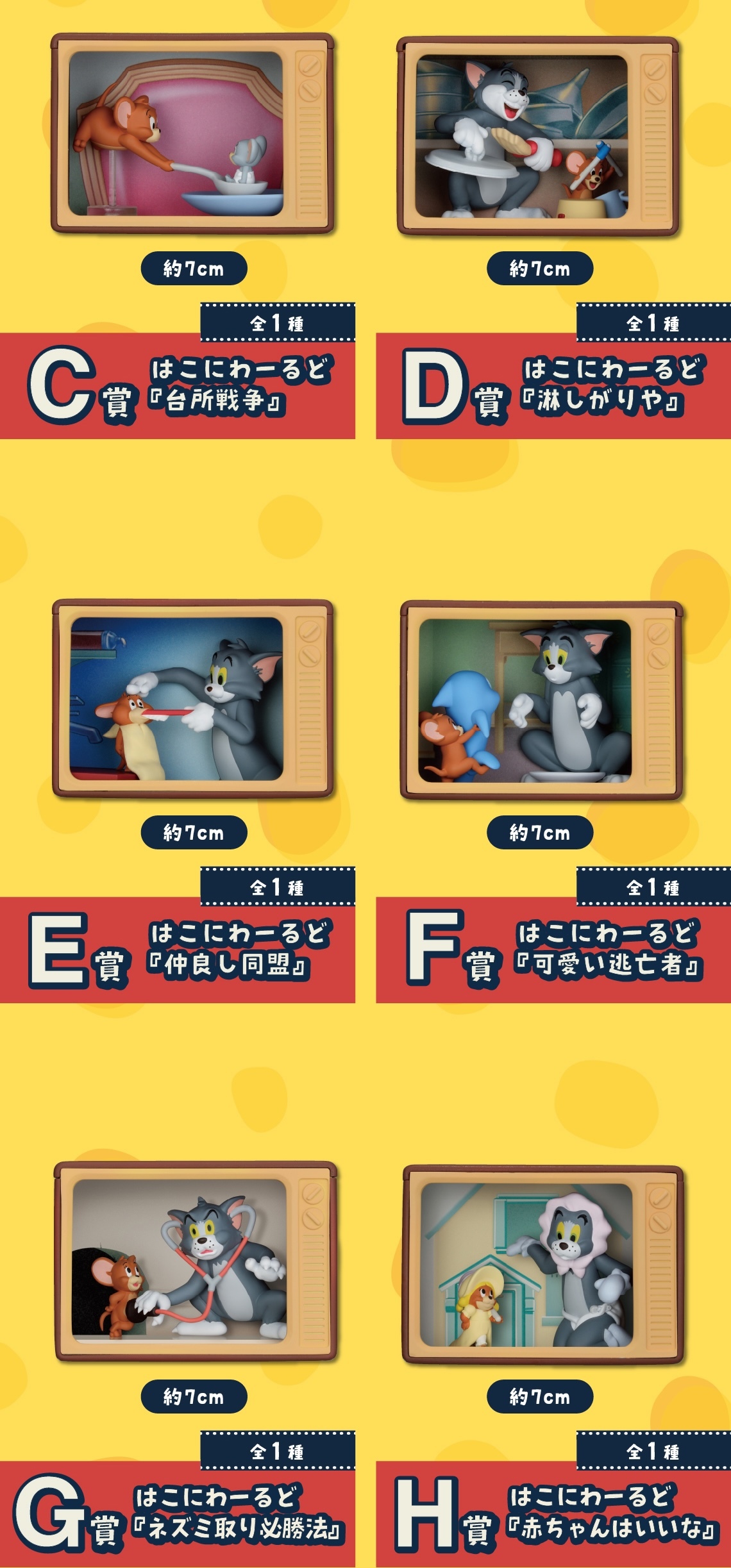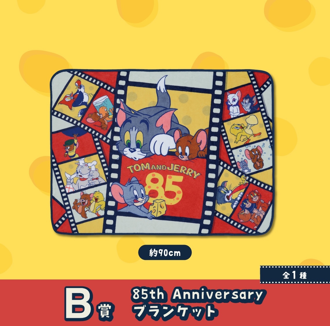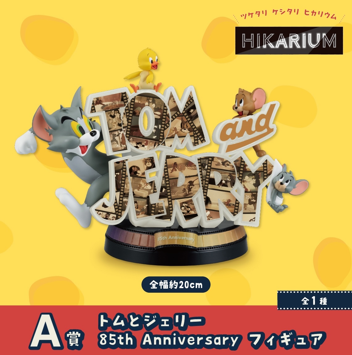 本次的「湯姆貓與傑利鼠 85 週年紀念」為紀念作品 85 週年,提供 A~K 、最後一賞與雙重中獎賞等不同級別的賞品。其中 A 賞為 85 週年紀念角色模型,中間的標準字採用了動畫場景的膠片設計,圍繞在周圍的湯姆、傑利、泰菲和金絲雀也都極具動態感,大大展現作品強烈的卡通風格!