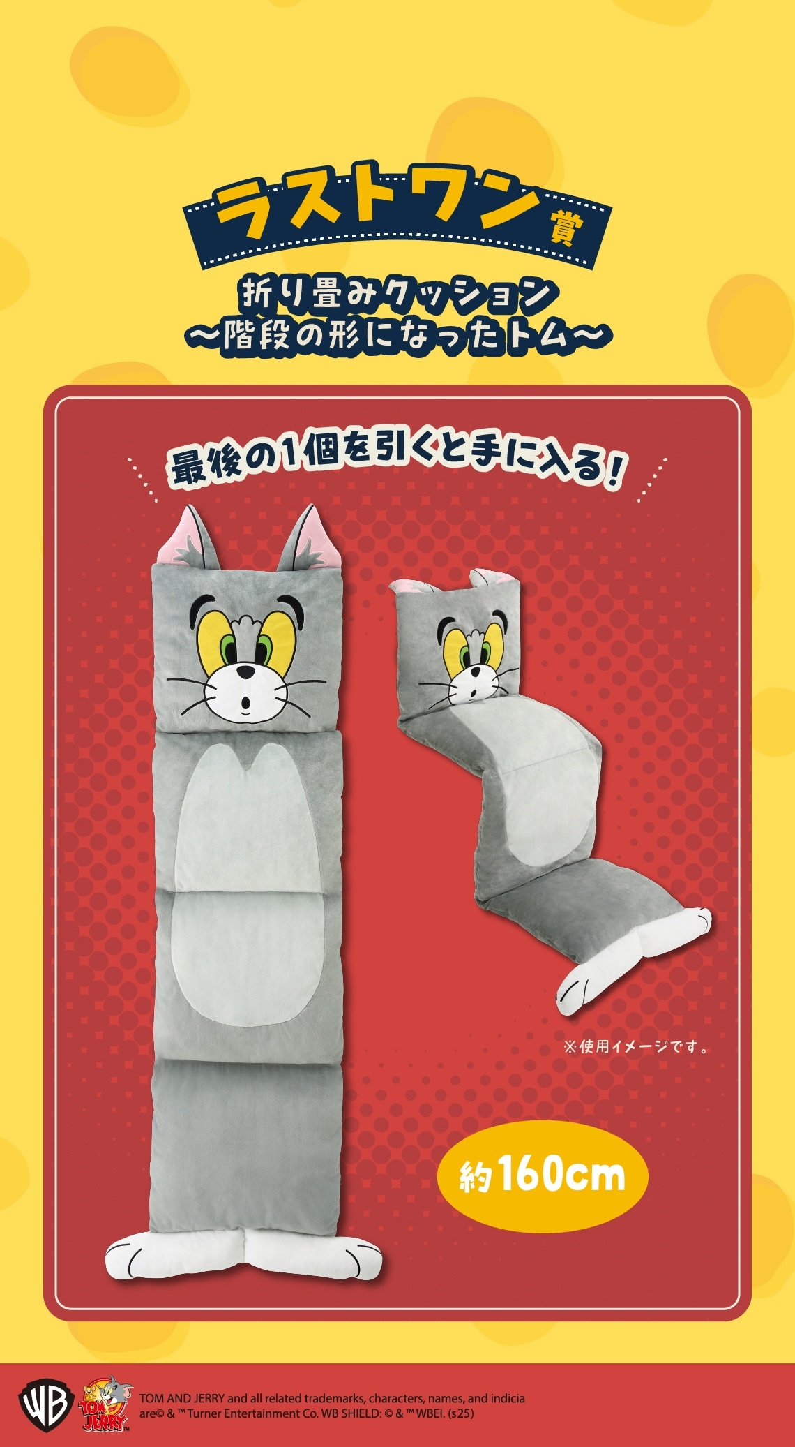 I~K 賞分別為經典漫畫封面畫布板、毛巾收藏及文具收藏,而最後一賞和雙重中獎賞則是經典的被壓成樓梯狀的湯姆貓造型抱枕,可以像劇中一樣將它摺疊放置在階梯上!每一款賞品都記錄了作品 85 年來的點點滴滴,也讓人感受到《湯姆貓與傑利鼠》歷久彌新的強大魅力!喜歡《湯姆貓與傑利鼠》的各位玩具人千萬不要錯過啦!