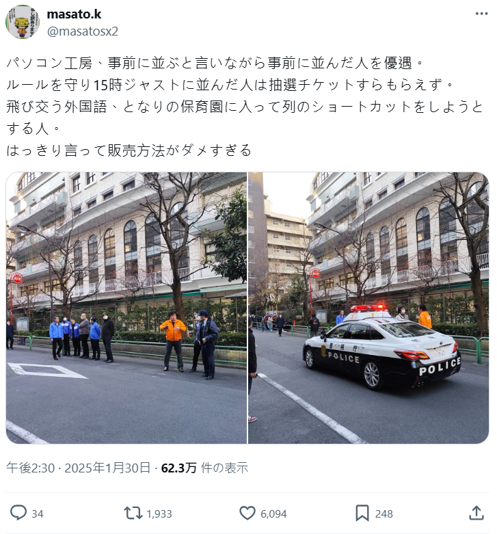 根據現場的網友指出,パソコン工房明明說好要當天排隊,結果卻優先發號碼牌給提前來排隊的人。老實遵守規則,準時 15 點才排隊的人,連抽選券都拿不到。現場滿是外語交雜的聲音,甚至還有人跑進旁邊的幼兒園想要抄捷徑插隊。
