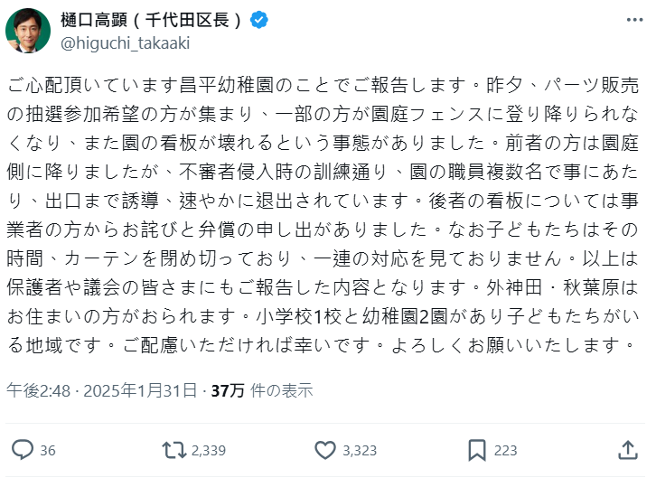 千代田區區長樋口高顯在個人 X 上,向幼稚園家長及區議會報告了這次事件的詳細經過: