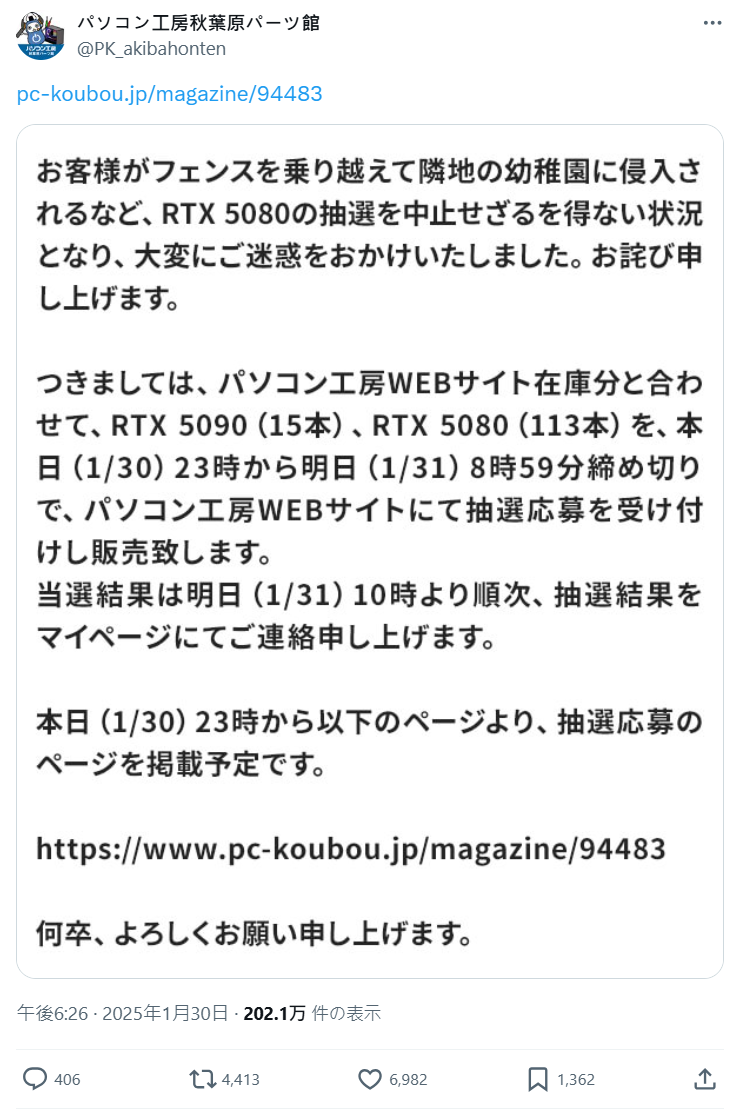 ▼ 由於現場陷入混亂,後續パソコン工房只能中止抽選活動,另外選隔日透過網路抽選來販售,造成不便對當地居民與消費者非常抱歉。同時,其他多間商店如 Sofmap、Dospara 也相繼改為線上販售,以避免類似情況發生。