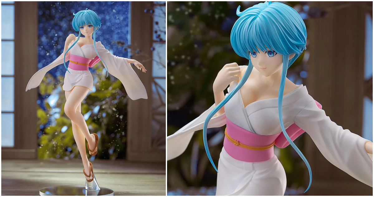 「POP UP PARADE 雪姬 L size」塗裝完成品,尺寸全高約 23 公分,還原留著兩束長鬢髪的淺藍色短髪,淡藍色雙眼與白皙肌膚相襯;白色的和服施漸層塗裝,自然呈現皺摺處的陰影,並營造輕薄的質感。低胸的領口敞開,飄逸的袖子與短版的衣襬,嶄露性感的身材與長腿!底座使用透明支架輔助,表現出輕盈的模樣!