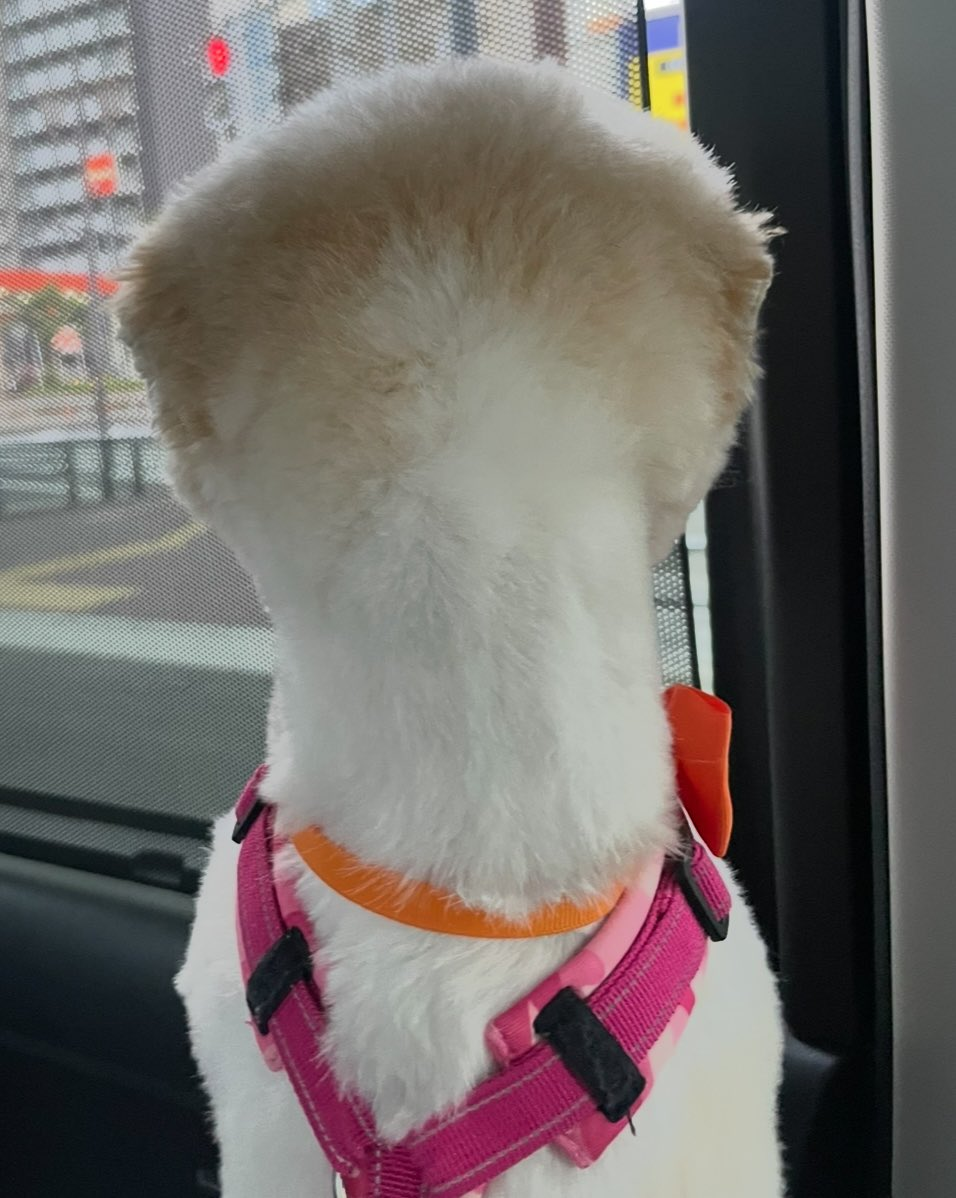 推主還分享這張拍到牠在抖動的瞬間,結果直接變身成杏鮑菇了 XD,也表示有時候理毛之後也會變成這樣。這真的是狗狗嗎,不要騙人了 ( ? )