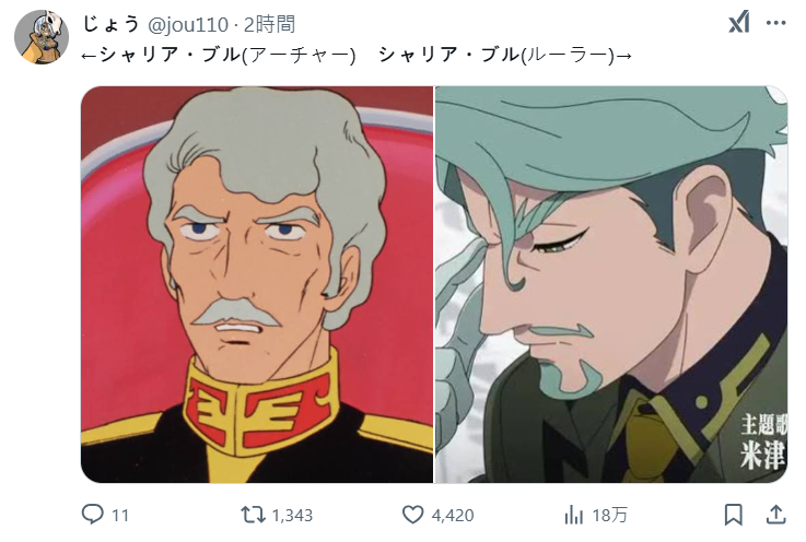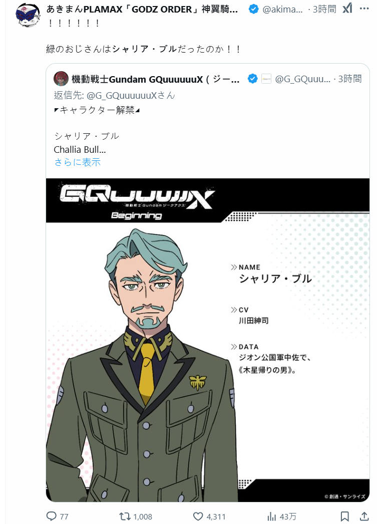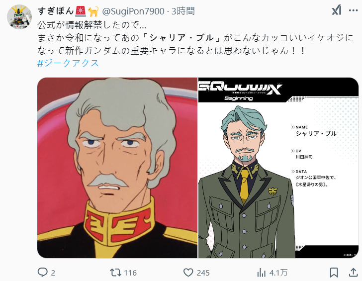 沒想到今日 ( 2/2 ) 官方公布第二波人設情報,其中先前預告片中不少人好奇身分的綠頭髮吉翁軍大叔,居然是過去《機動戰士鋼彈》的夏利亞·布爾,這人物造型的變革也讓不少網民驚訝不已,成為 X 熱搜話題。