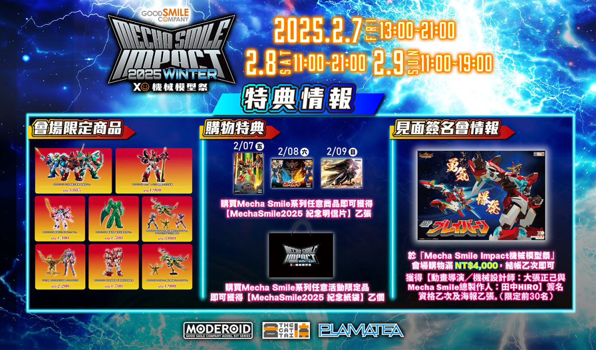 Mecha Smile Impact 機械模型祭(#GSC機械模型祭2025)本次也有帶來全新活動限定商品:海外最快發售——《真蓋特機器人 世界最後之日》「MODEROID 真蓋特1 蓋特光線透明色Ver.」及《魔動王》「MODEROID 超級火王 EX Color Ver.」!另外有會場限定商品:特製A4資料夾!當然不少會場購物特典:紀念明信片及紀念紙袋,明信片設計活動三天皆不同款式!