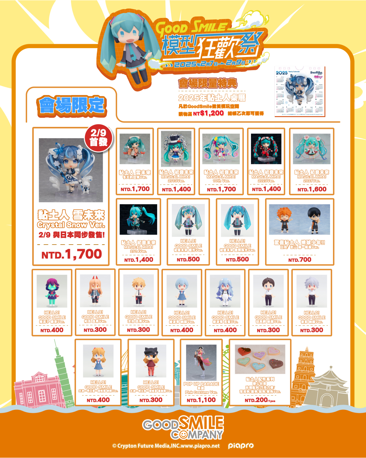 台北地下街「六號廣場」:首次推出「Good Smile 微笑模玩空間」本空間將帶來「黏土人系列」、「HELLO! GOOD SMILE」與「POP UP PARADE」等人氣品牌的新作與人氣商品的展示!近百隻黏土人的特別展示、歷代黏土人雪未來專區(有部分未展示),以及 HELLO! GOOD SMILE 初音未來的立像等,讓玩家能沉浸於模型的世界。